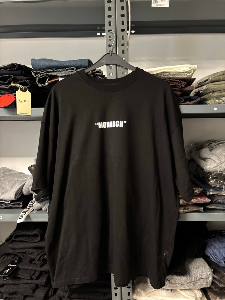 Siyah keten kumaştan, oversize kesim ve yuvarlak yaka, önünde "MONARCH" baskısı bulunan sokak tarzı tişört.