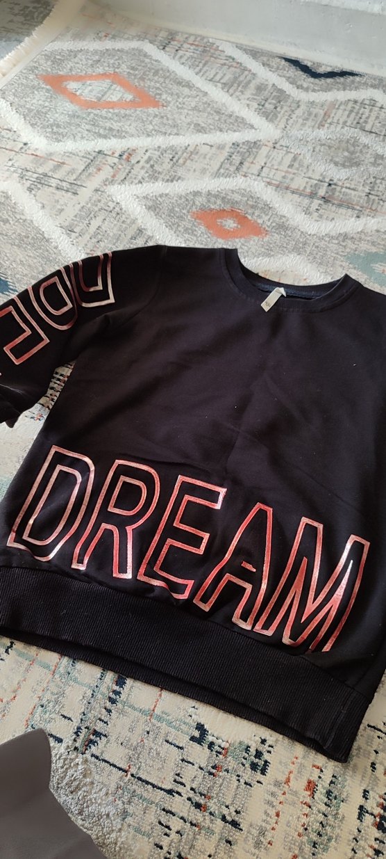 Siyah pamuklu kumaştan, uzun kollu ve bisiklet yaka. Oversize kesim, baskılı "DREAM" yazısı ve fermuar detayıyla rahat bir sweatshirt.