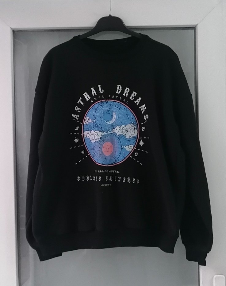 Siyah renkli, yuvarlak yaka ve uzun kollu oversize sweatshirt. Önünde baskılı desen bulunur, yumuşak ve sıcak kumaştan üretilmiştir.