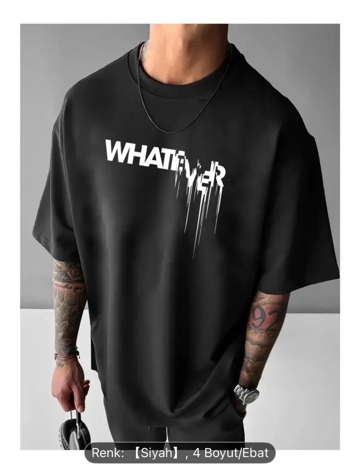 Siyah, kısa kollu, oversize kesim, baskılı "WHATEVER" yazılı tişört. Sentetik kumaştan, rock punk sokak stilini yansıtıyor. M L XL XXL BULUNUR