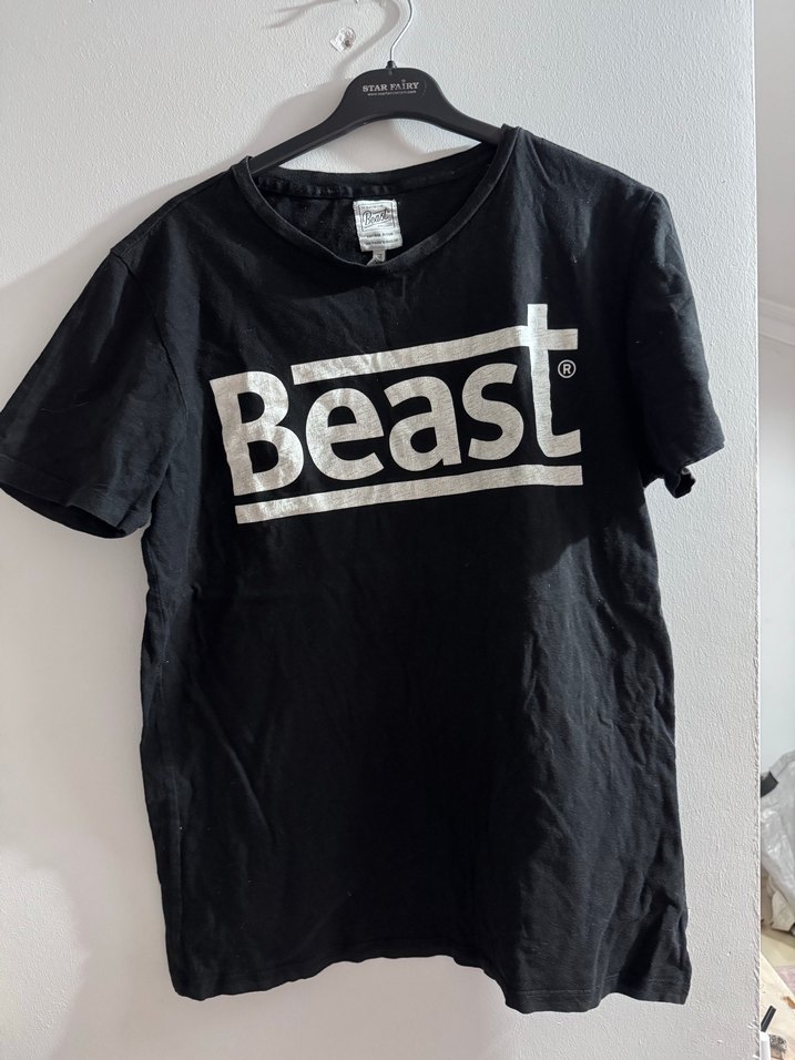 Siyah, kısa kollu ve yuvarlak yakalı, oversize kesim tişört, üzerinde büyük "Beast" baskısı ile sokak tarzı sunar.