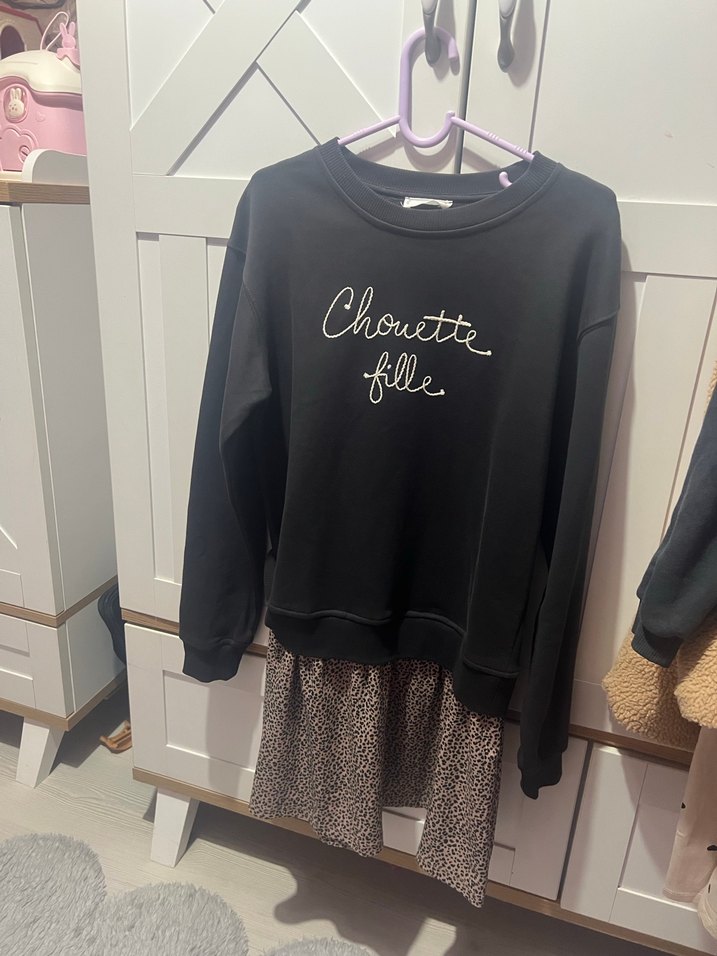 Siyah pamuklu sweatshirt, bol kesim, uzun kollu ve bisiklet yaka. Baskılı ve fırfırlı detaylı, günlük kullanıma uygun rahat model. 12/13 yas uygun