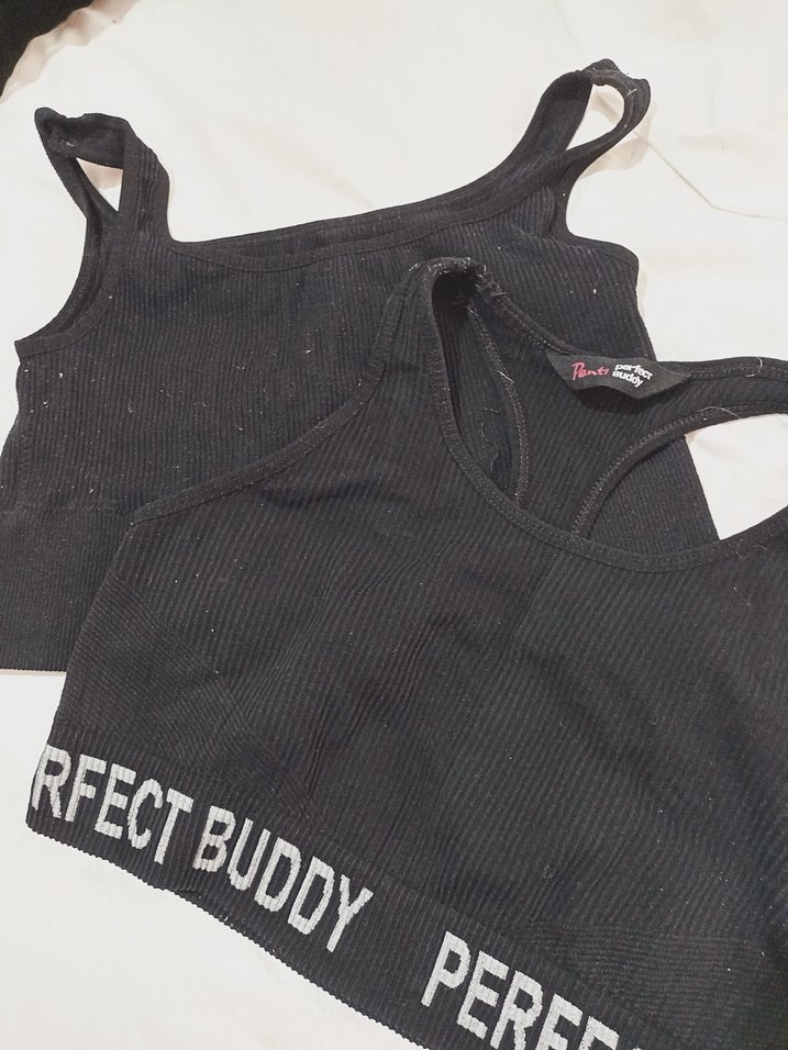 Siyah pamuklu kız atleti, elastik ve baskılı 'PERFECT BUDDY' yazısıyla, straplez ve fitted kesime sahiptir. Sokak stiline uygun.