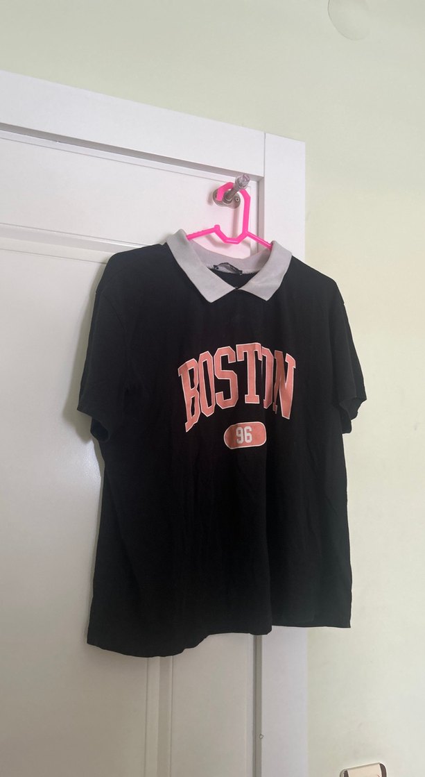 Siyah, baskılı ve düğmeli kısa kollu hamile tişörtü. Yakalı, bol kesim ve günlük kullanıma uygun yumuşak sentetik kumaştan yapılmıştır.