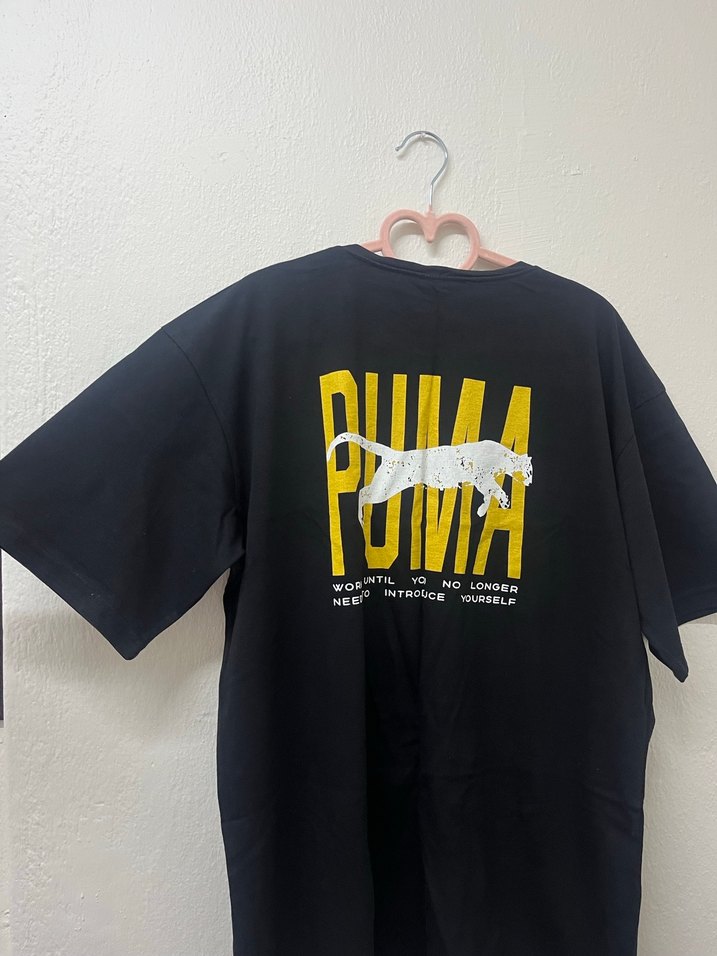 Siyah, baskılı Puma tişört, kısa kollu ve bol kesim. Yumuşak, sıcak kumaştan üretilmiş, spor için uygun.