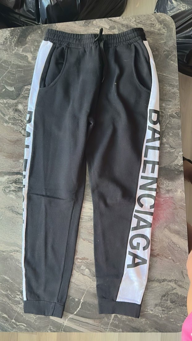 Yumuşak tüylü kumaştan, yanları "BALENCIAGA" baskılı siyah rahat kesim erkek eşofman, lastikli bel kısmı ile dış mekan kullanımı için uygun.