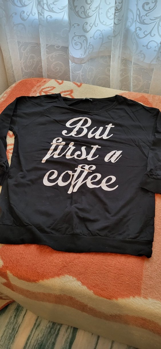 Pamuklu kumaştan yapılmış siyah, uzun kollu, rahat kesim kadın sweatshirt. Önünde "But first a coffee" baskısı bulunur, günlük sokak stili için uygundur. ☕