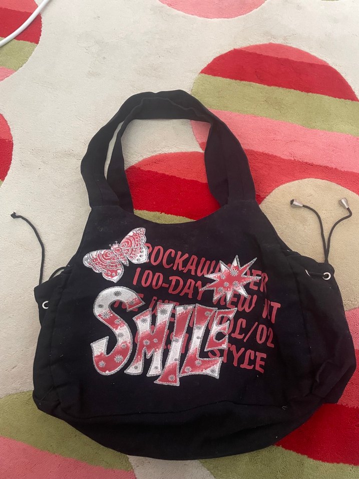 Siyah baskılı rock punk desenli, sentetik kumaşlı, fermuarlı kadın çantası. Günlük kullanım için uygun, grunge punk tarzında.