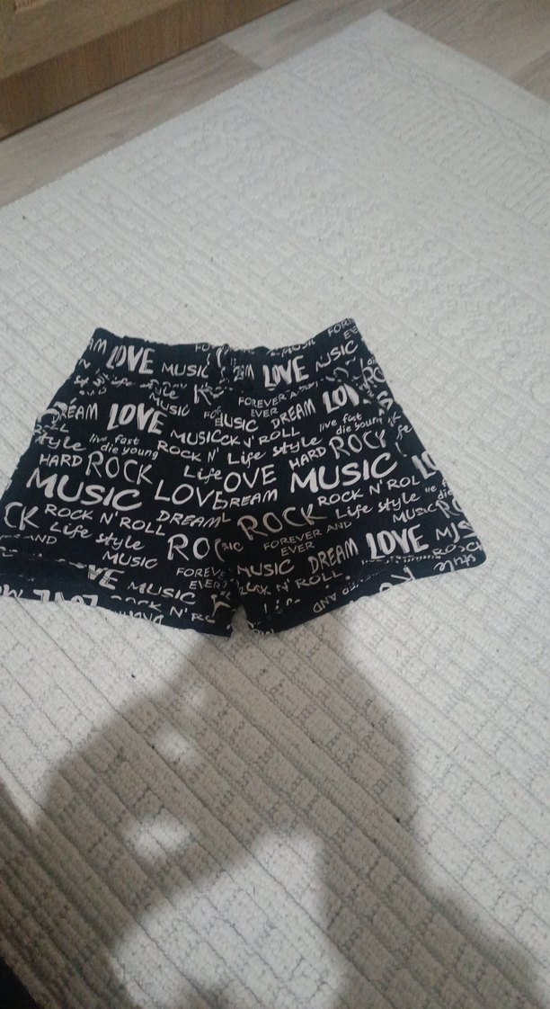 Siyah pamuklu mini şort, bol kesim ve lastikli bel ile. Üzerinde gri rock ve müzik temalı baskılar bulunur. Günlük kullanım için uygundur.
