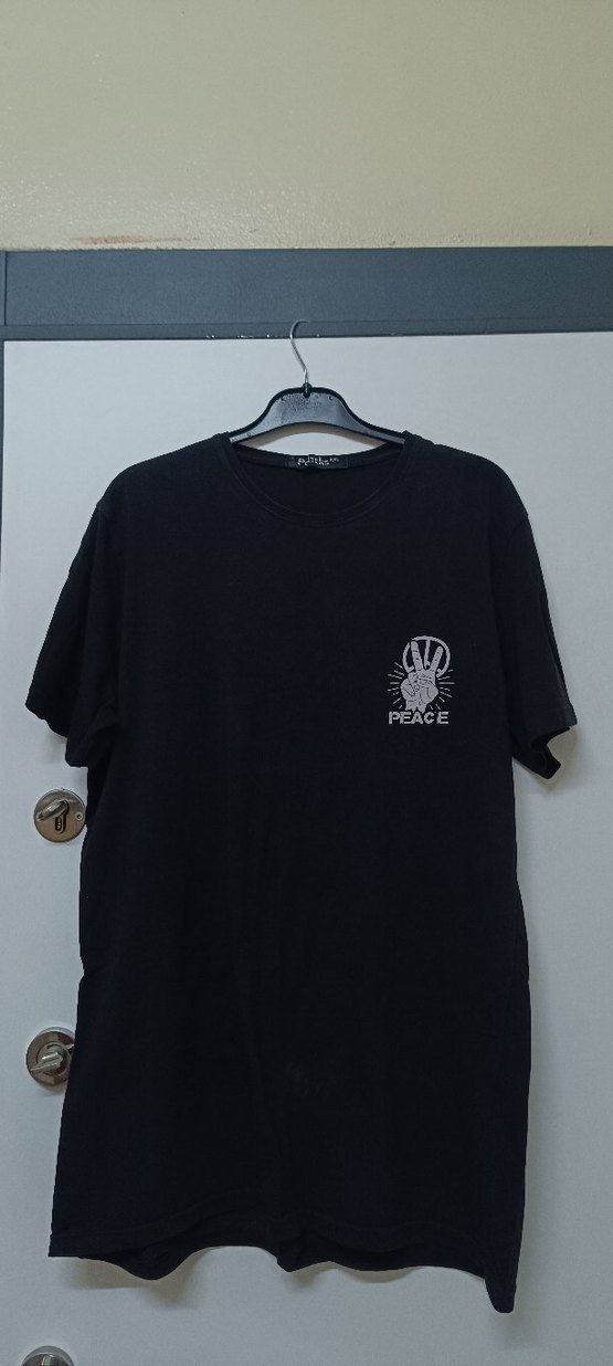 Siyah pamuklu, bol kesim kısa kollu tişört, barış işareti baskısıyla. Yuvarlak yaka ve normal boy, rahat sokak stili için uygundur. ✌️