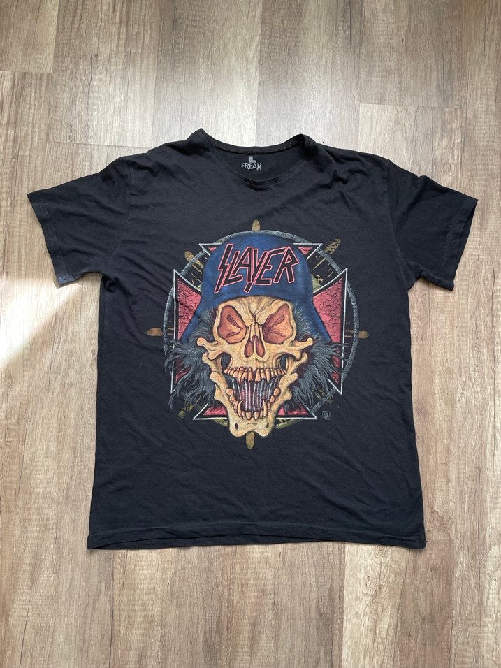 Siyah baskılı, kısa kollu, yuvarlak yaka, bol kesim slayer baskılı tişört. Normal uzunlukta ve rahat bir görünüme sahip.