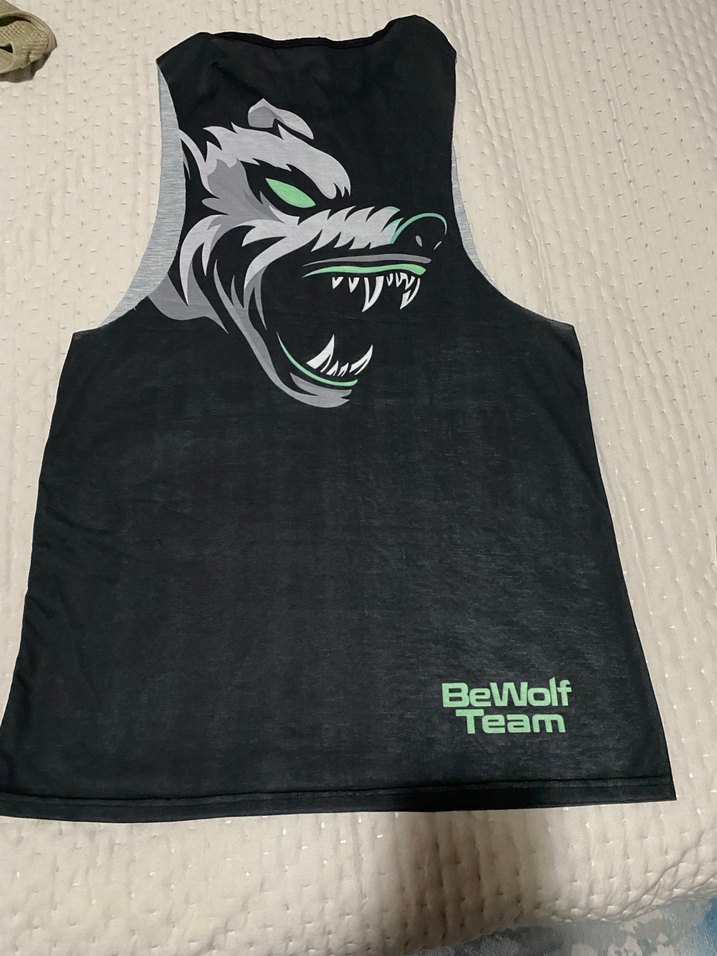 Siyah, baskılı ve fit kesim spor atlet, sentetik kumaştan, yuvarlak yaka ve cırt cırt detaylıdır. Üzerinde 'BeWolf Team' yazısı ve kurt görseli bulunur.