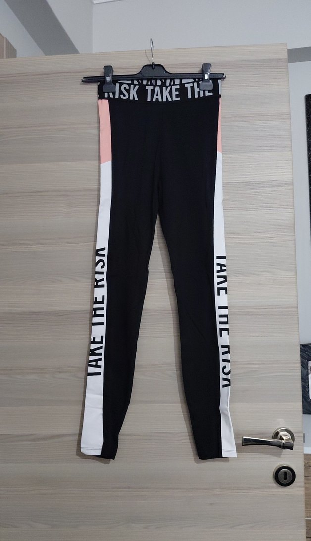 Siyah baskılı yan şeritlere ve elastik bele sahip, sentetik kumaştan yapılmış, spor için uygun, trend sokak stili tayt. ♀️
