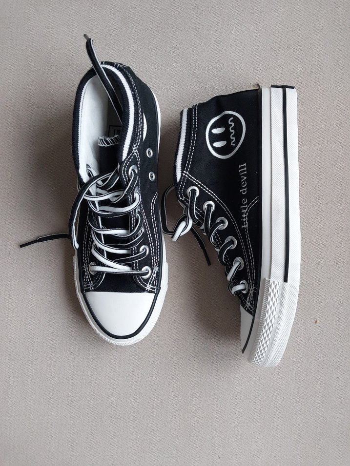 Baskılı detaylara ve stiletto topuğa sahip siyah sokak modası spor ayakkabı. Kauçuk tabanlı ve kolay kullanım için cırt cırtlı, günlük kullanım için uygun.