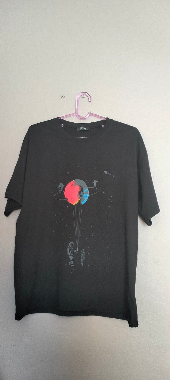 siyah, baskılı, bol kesim, bisiklet yaka t-shirt Astronot ve gezegen temalı renkli baskı içerir.