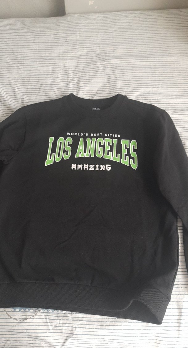 Uzun kollu, yuvarlak yaka, bol kesim siyah sweatshirt. Üzerinde 'LOS ANGELES AMAZING' baskısı bulunur, günlük rahat kullanıma uygun.