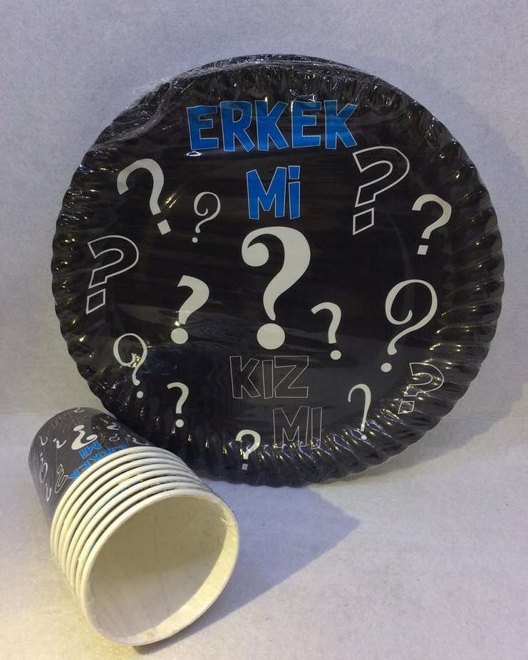 Siyah renkte, "ERKEK Mi?" ve "KIZ Mi?" yazılı baskılı tabak ve bardak seti, counterculture tarzında tasarlanmıştır.