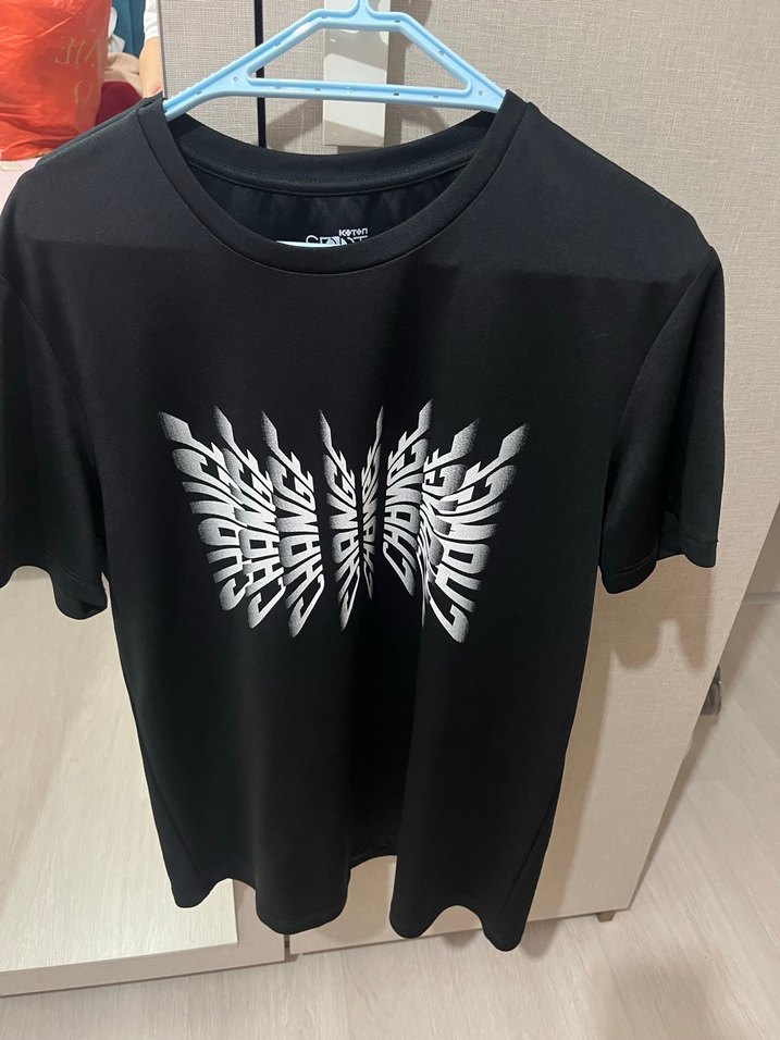 Siyah renkli, baskılı grafik detaylı, kısa kollu ve normal boyda bol kesim tişörtü.