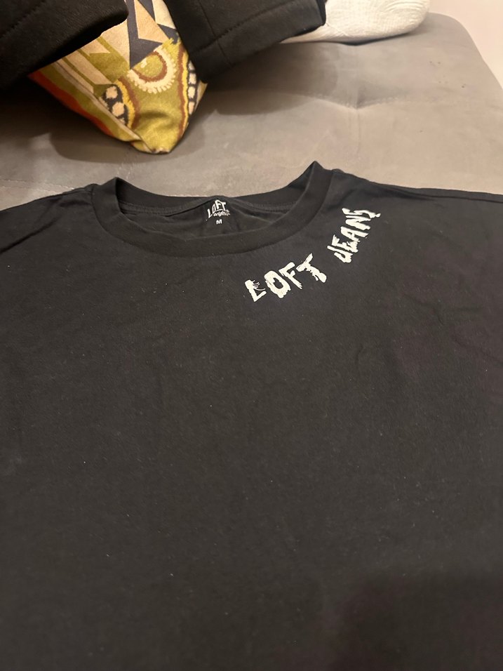 Siyah tişört, yuvarlak yaka, uzun kollu ve bol kesimdir. Pamuk kumaştan yapılmış, yakada baskılı detay vardır ve günlük kullanım için rahat şıklık sunar.