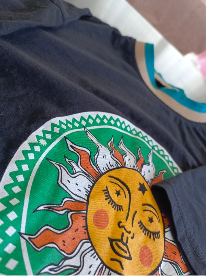 Renkli baskılı güneş deseniyle yumuşak tişört☀️koyu siyah renkte telefon ışığından dolayı solgun görünüyor