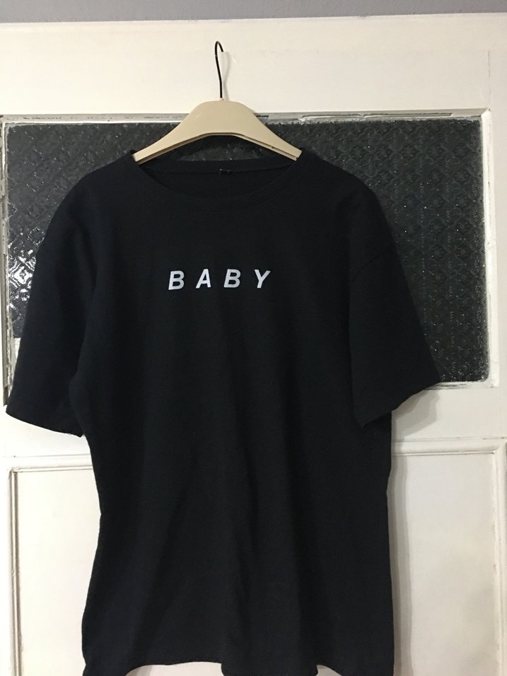 Kısa kollu, yuvarlak yaka, siyah hamile tişörtü. "BABY" baskılı, pamuklu ve rahat kesim. Günlük rahta kullanım için uygundur.