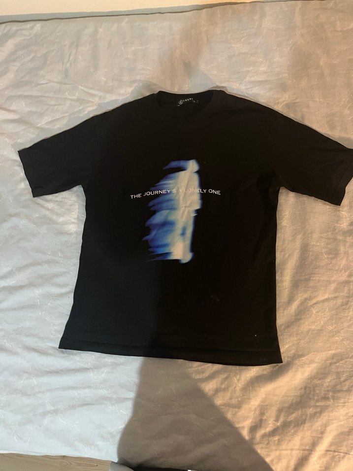 Siyah renkli, baskılı, kısa kollu ve salaş kesimli erkek tişörtü. Yumuşak ve ipeksi dokusu günlük kullanım için uygundur.