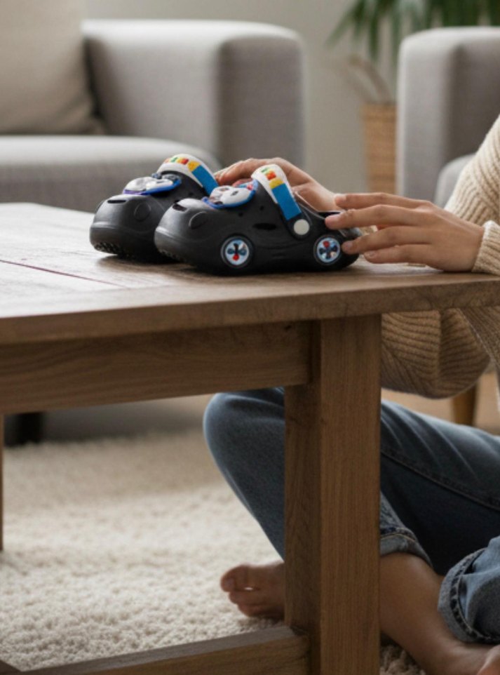 Siyah renkte, tokalı ve baskılı desenli, dayanıklı kauçuk malzemeden yapılmış erkek çocuk terliği.