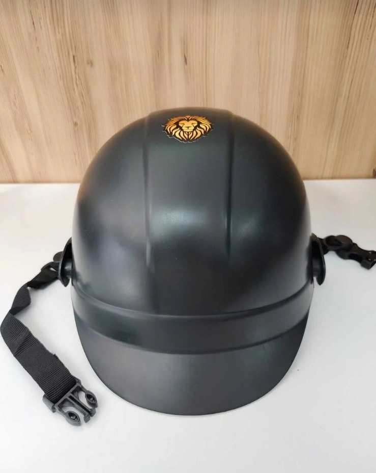 Siyah plastikten yapılmış, tokalı kayışı ve üzerinde baskılı aslan deseni bulunan motosiklet kaskı. Minimalist ve rock punk tarzında. ️