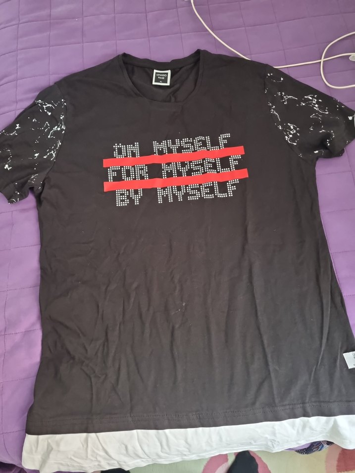 Siyah renkli, kısa kollu ve bisiklet yaka unisex tişörtü. . etiketini çikarttik fakat hic kullanilmadı . Boy 81cm , en 51 cm