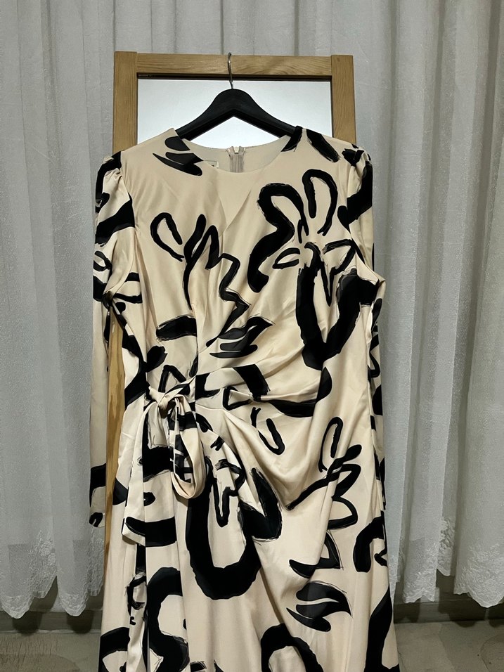 Beyaz renkte, uzun ve bol kesimli bu elbise, drapeli tasarımı ve siyah baskılarıyla dikkat çeker. İpek gibi kumaştan, bisiklet yaka ve askılı kolludur. Günlük kullanıma uygundur.