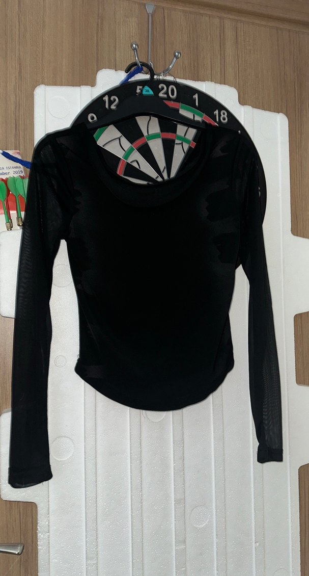 Siyah, uzun kollu, boğazlı ve baskılı tasarıma sahip, sentetik kumaştan yapılmış dar kesim bluz. Spor ve gotik tarzlar için uygundur.