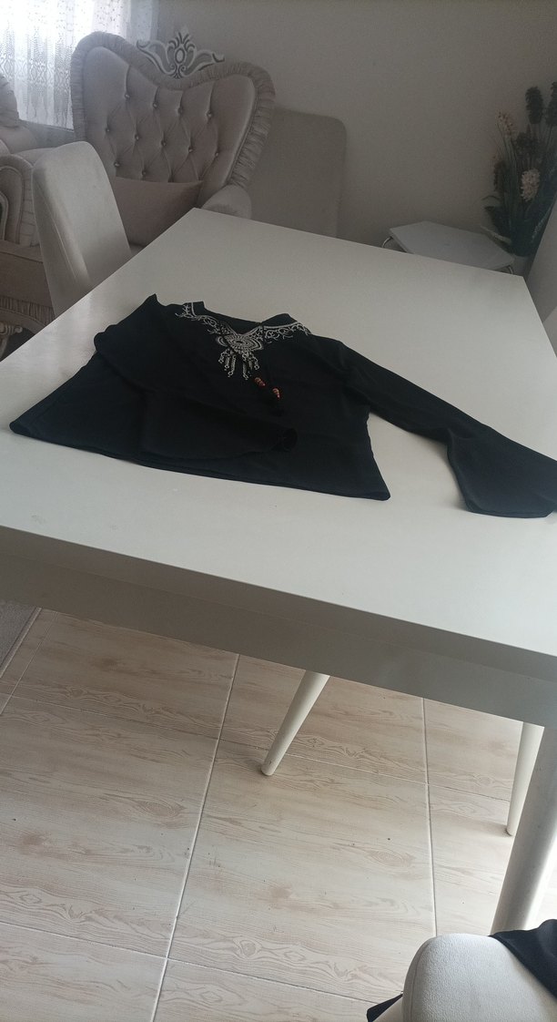 Uzun kollu, yüksek yakalı siyah hamile bluzu, baskılı deseni ve kemerli bel detayıyla rahat ve gotik bir tarz sunar. Günlük kullanıma uygundur.