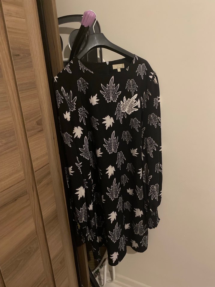 Siyah renkte, baskılı yaprak desenli, uzun kollu, bol kesim hamile elbisesi. Drapeli tasarımıyla günlük sokak stiline uygundur.