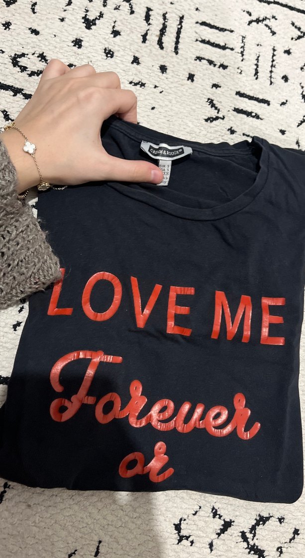 Bu siyah kısa kollu ve yuvarlak yakalıdır. Rahat kesimi ve "LOVE ME Forever" baskısı ile romantik akşamlar için uygundur. Pamuklu kumaştan üretilmiştir.