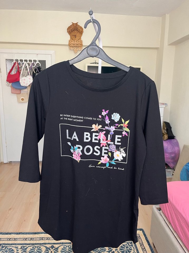 Pamuklu, siyah, uzun kollu hamile tişörtü. Salaş kesim ve yuvarlak yaka. Üzerinde "LA BELLE ROSE" yazılı çiçekli baskı bulunur. Günlük kullanıma uygun.