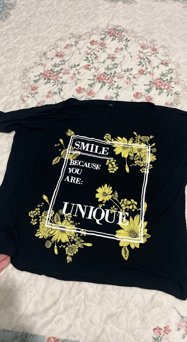 Siyah renkli, uzun kollu ve salaş kesim hamile tişörtü. Üzerinde sarı çiçek baskısı ve 'SMILE BECAUSE YOU ARE UNIQUE' yazısı bulunur. Sentetik kumaş kullanılmış.