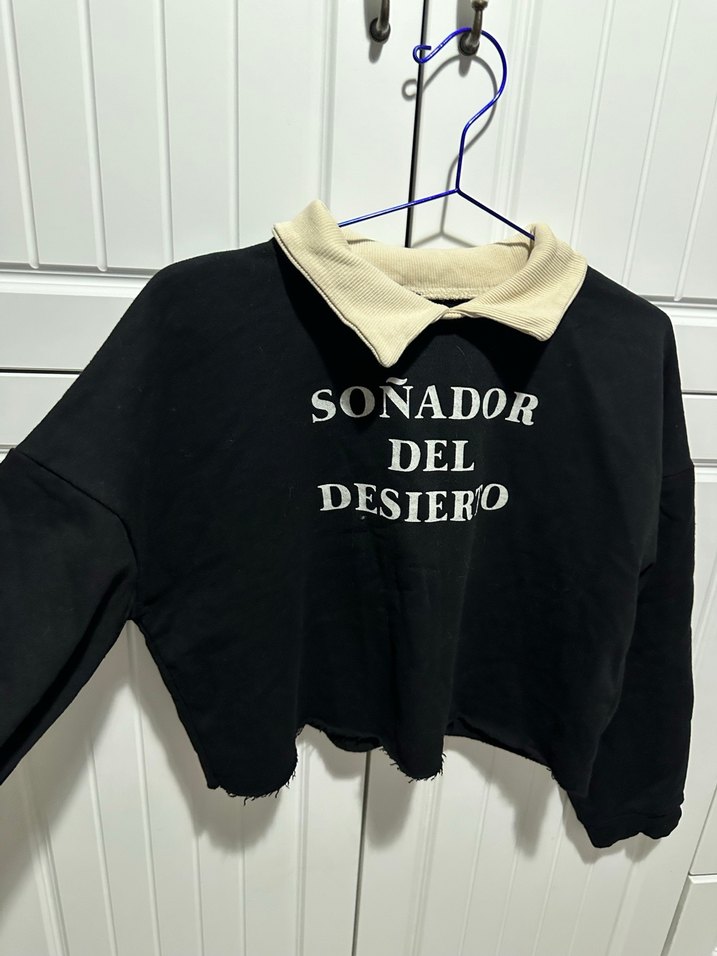 Pamuk siyah sweatshirt, yakalı ve bol kesimli, üzerinde 'SOÑADOR DEL DESIERO' baskısı bulunur. Günlük kullanıma uygun rahat ve şık.