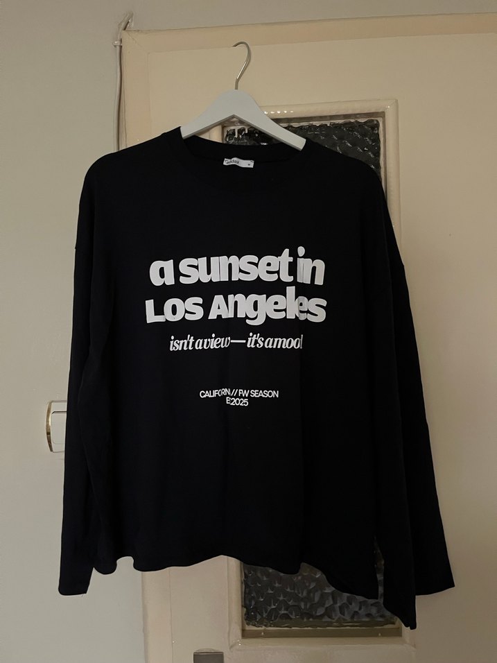 Siyah renkli, uzun kollu ve bisiklet yaka kadın sweatshirtü, 'a sunset in Los Angeles' baskılıdır. Bol kesim ve normal uzunlukta, keten kumaştan yapılmıştır. Günlük kullanıma uygun rahat bir parça.