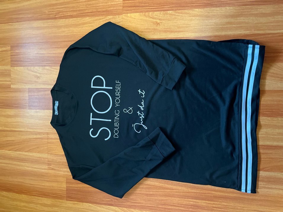 Pamuk siyah kumaştan, uzun kollu ve yuvarlak yaka, bol kesim kadın sweatshirtü. Üzerinde baskılı yazılar bulunan, uzun ve rahat bir parça.