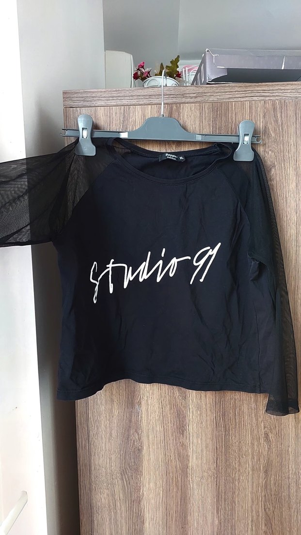 Siyah, baskılı ve bol kesim kız tişörtü, yuvarlak yakalı ve drapeli şeffaf uzun kollara sahip, sentetik kumaştan üretilmiştir.