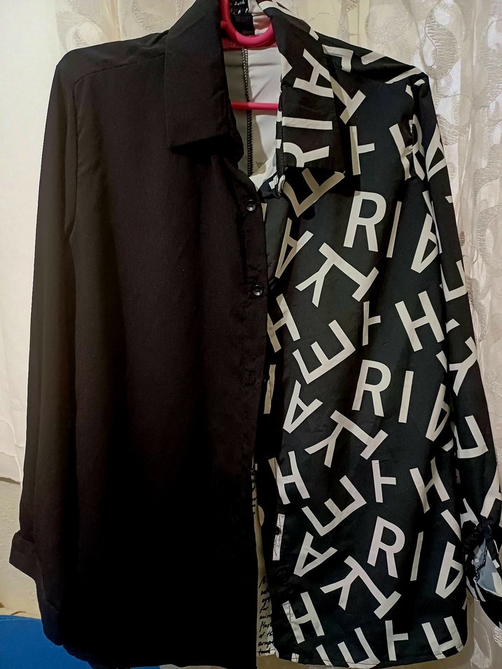 Uzun kollu, yüksek yakalı siyah kadın gömleği. Baskılı deseni ve bol kesimiyle günlük kullanıma uygundur. Hiç giyilmedi.