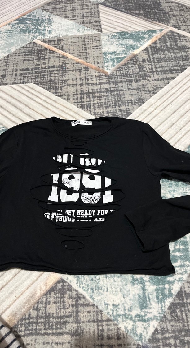 Pamuk siyah uzun kollu, salaş kesim hamile tişörtü. Baskılı ve yırtık detaylı, kısa boylu ve günlük kullanıma uygun, grunge punk tarzında.