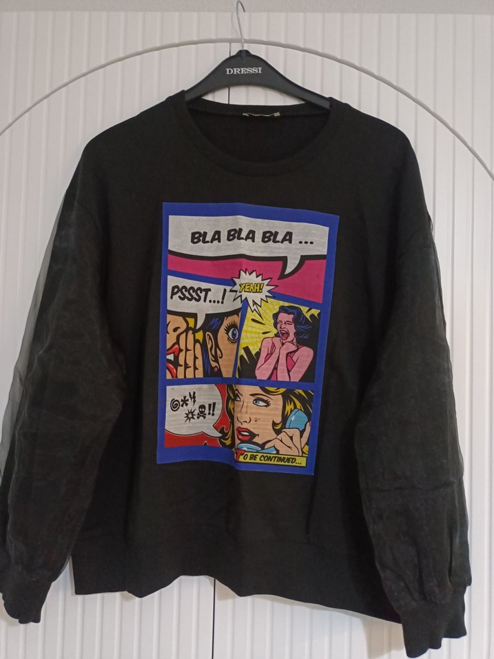 Siyah, uzun kollu ve bisiklet yaka sweatshirt, önünde renkli çizgi roman baskısı bulunur. Kolları balon kol gibi ve tül detaylı.