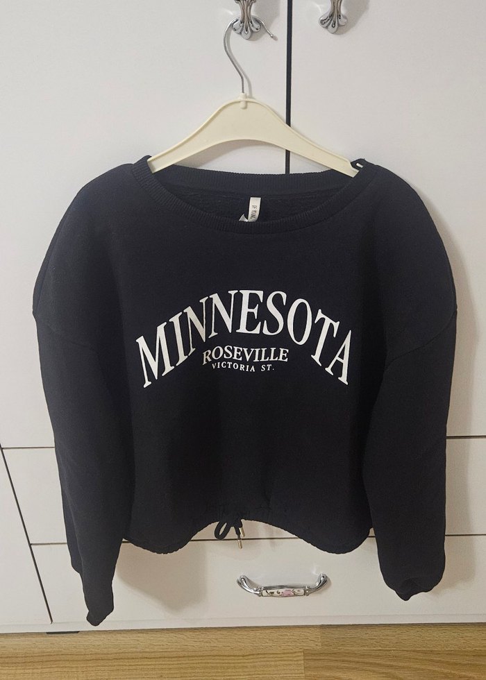 Bu siyah sweatshirt, uzun kollu, yuvarlak yakalı ve rahat kesimlidir. Yumuşak ve sıcak kumaştan üretilmiş olup, üzerinde 'MINNESOTA ROSEVILLE' baskısı vardır. Günlük kullanım için uygun şık ve rahat bir parça.