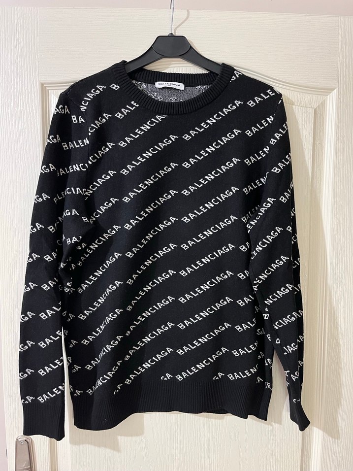 Siyah, uzun kollu, triko dokuma ve baskılı desene sahip, 'BALENCIAGA' yazılı, salaş kesim ve bisiklet yakalı kazak
