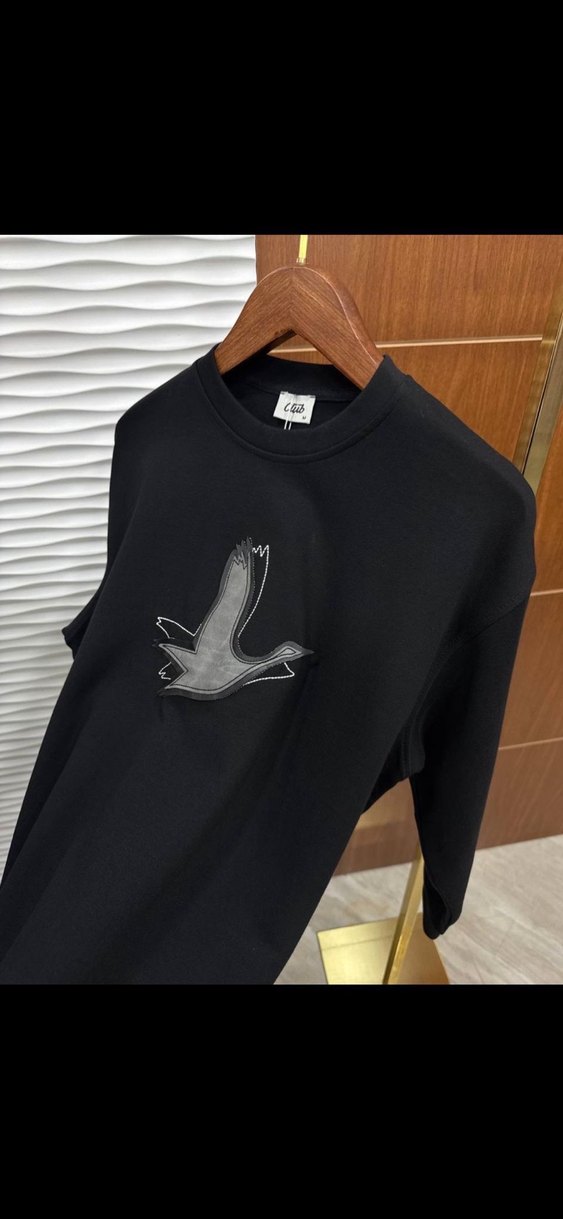 Siyah renkli, baskılı kuş deseni olan uzun kollu erkek tişörtü, bol kesim ve yumuşak, sıcak tutan kumaştan üretilmiştir.