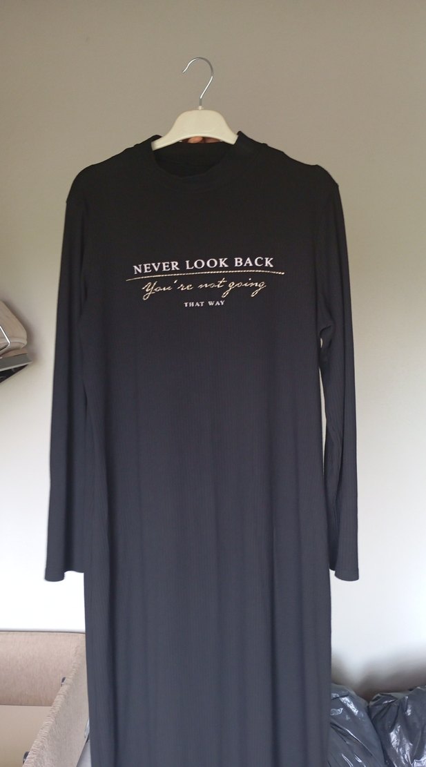 Siyah uzun kollu, yuvarlak yaka ve bol kesim elbise. Önünde 'NEVER LOOK BACK, THAT WAY' baskısı bulunur. Günlük kullanıma uygun, ipeksi dokuda rahat bir parça.