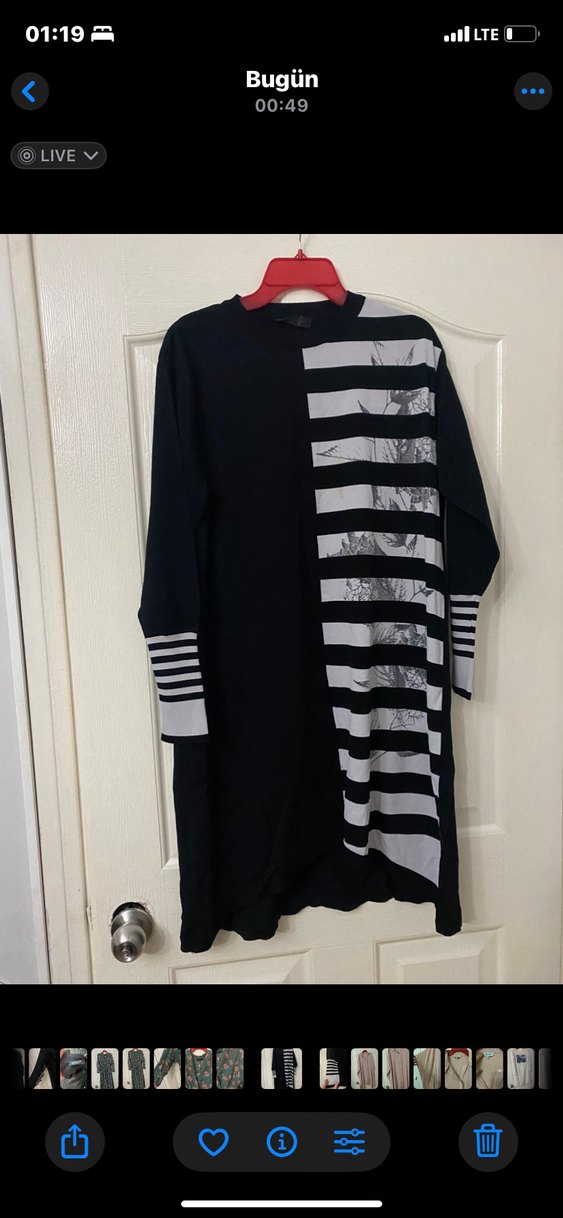 Siyah, baskılı çizgili, dökümlü uzun tunik. Uzun kollu, bol kesim ve yuvarlak yaka ile günlük kullanıma uygun. Ön kısmında belli belirsizlik leke mevcut kumaşı güzel 38 40 beden uygun