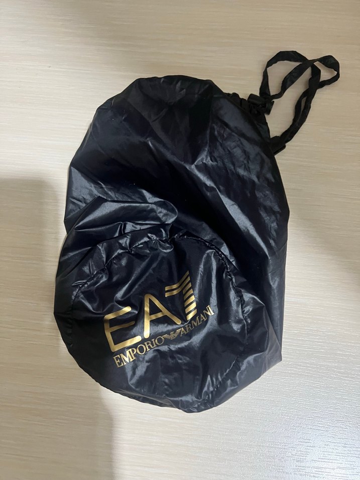 Baskılı logolu siyah yagmurluk çantası, ipli kapanışlıdır. Hafif ve taşınması kolaydır.