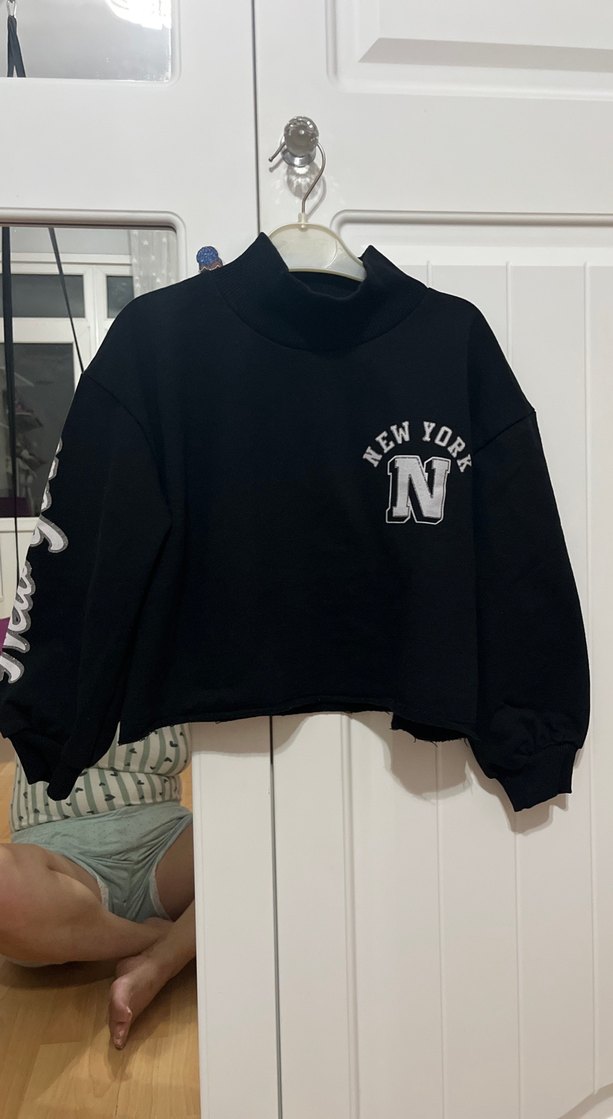 Siyah, uzun kollu, yarım boğazlı ve bol kesim sweatshirt. "New York" baskılı detaylar ve yumuşak örme kumaş içerir.